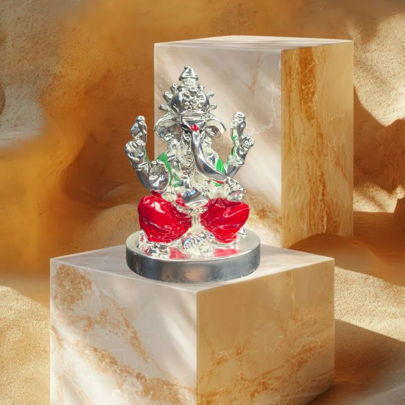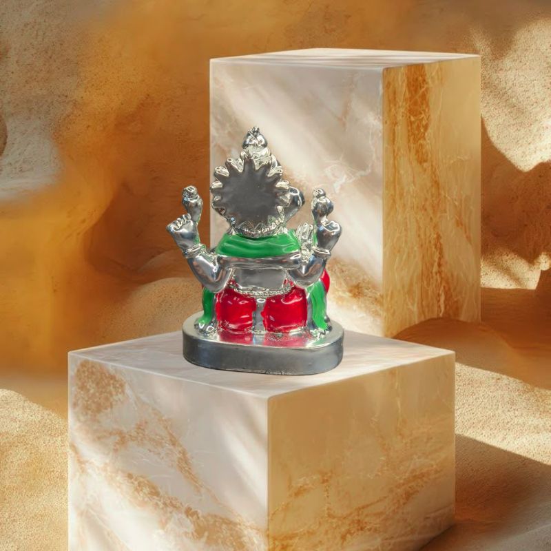 Enhanced with detailed silver plating and festive red-green garments, this idol adds a touch of sacred beauty and traditional charm to your pooja room, living area, or workspace.