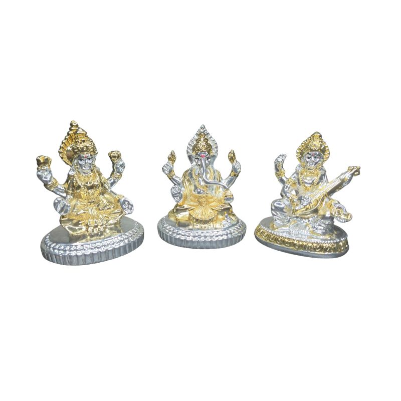 Bring home the sacred blessings of Maa Lakshmi, Lord Ganesha, and Maa Saraswati with this beautifully crafted Gold & Silver Plated Idol Set. This divine trio represents wealth, wisdom, learning, and auspicious beginnings, making it an essential addition to your puja altar, home, or workspace.