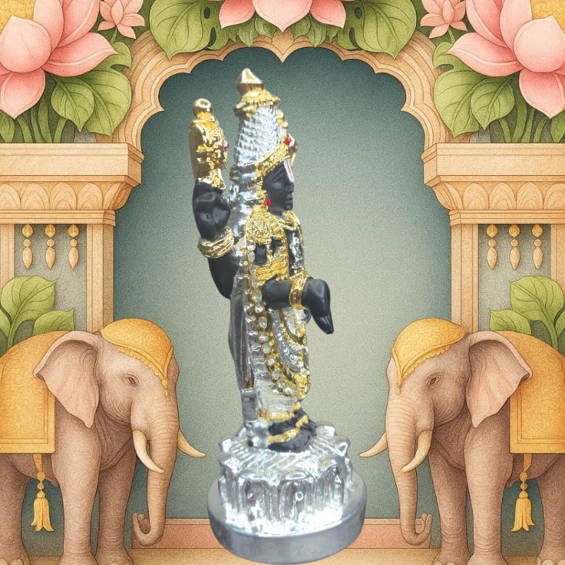 Adorned with a rich blend of gold and silver plating, this idol radiates unmatched brilliance and sacred charm. Each detail—whether in the crown, ornaments, or divine posture—has been meticulously crafted to capture the grandeur and magnificence of Lord Balaji.