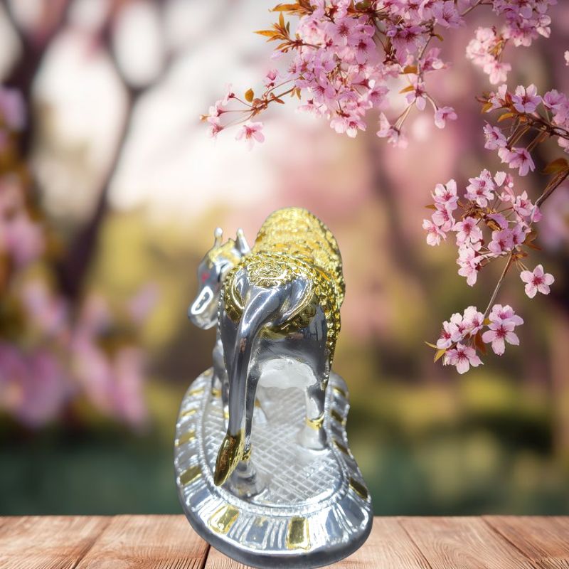 This beautiful idol showcases the divine cow adorned with deities and ornaments, radiating positive vibrations and divine energy. A perfect blend of golden radiance and silver purity, this piece enhances both spiritual devotion and elegant décor.